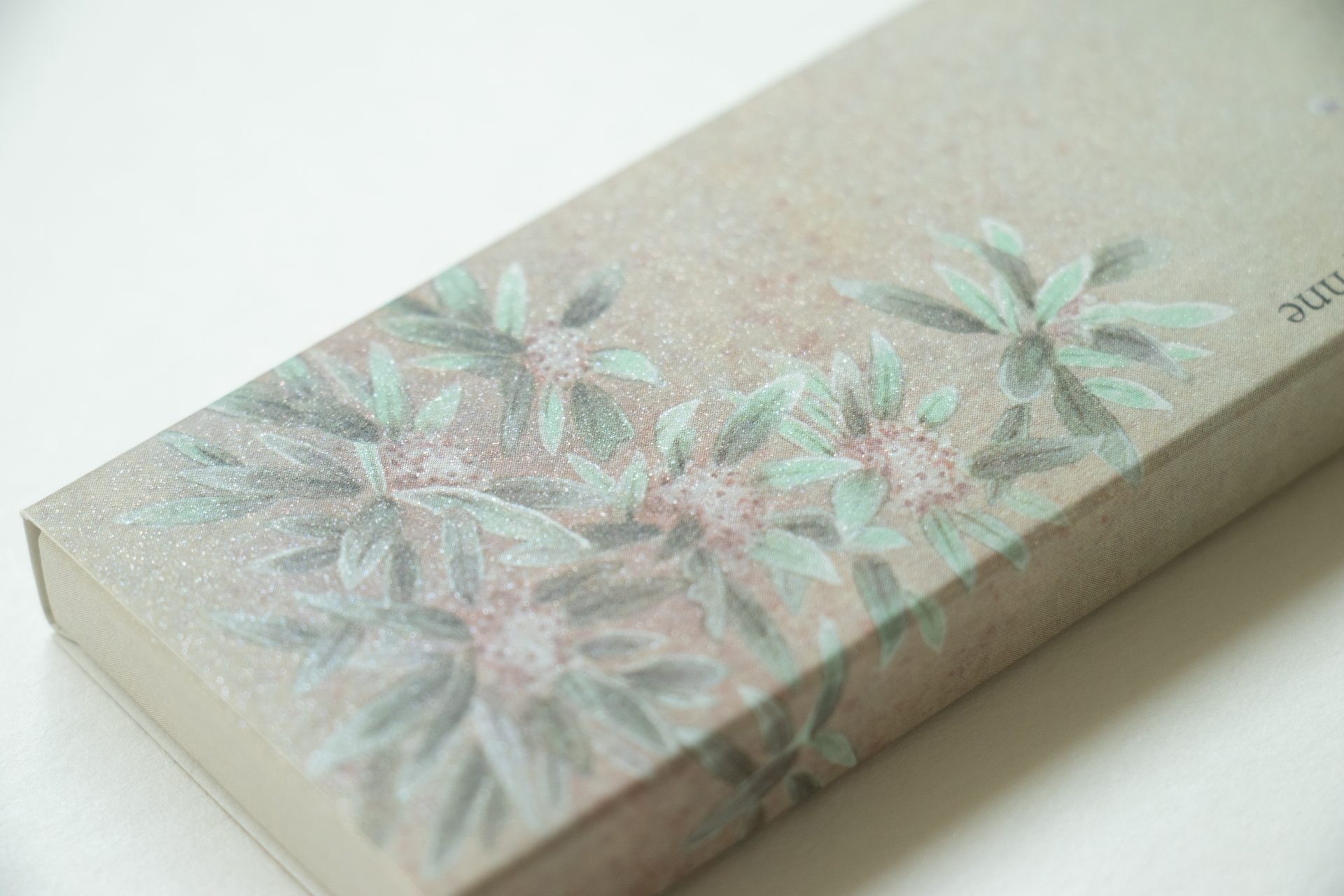 | 商品詳細 | 四季を想う和の心をいつも傍にと願うお香。 華やかに香りながら、どこか控えめで奥ゆかしいシリーズです。 春の沈丁花、初夏の泰山木と藤、盛夏の蓮、秋の金木犀に冬の水仙。 市井の庭には日々の暮らしの中で花の香りを通して四季を愉しむ工夫がありました。 縁側で本を読んだり物を書いたりしていると、季節の香りに満たされ心が潤う。 今は昔のそんな情景を、墨の香を織りまぜ繊細に表現しました。 パッケージには、日本画家・定家亜由子氏の美しい花の日本画を あしらっており、一年を通して贈りものにも最適なデザインです。 沈丁花 Daphne 春の到来を告げる、小花をたわわに咲かせる低木樹です。グリーン調の芳醇な甘い香りが空間を包みます。 花言葉は「永遠」「不滅」「栄光」 |